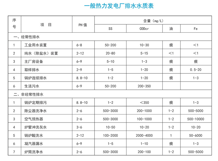 根據(jù)熱力發(fā)電廠生產(chǎn)特點,廢水分兩大類:一是經(jīng)常性排水,含酸含堿廢水、設(shè)備反洗廢水和生活污水;二是非經(jīng)常性排水,含油廢水、設(shè)備定期排污廢水、化學(xué)清洗廢水。早期熱力發(fā)電廠只對含酸含堿廢水和化學(xué)清洗廢水進行處理外,其余廢水直接排放,當今要求熱力發(fā)電廠對產(chǎn)生所有廢水分類處理,達標排放。