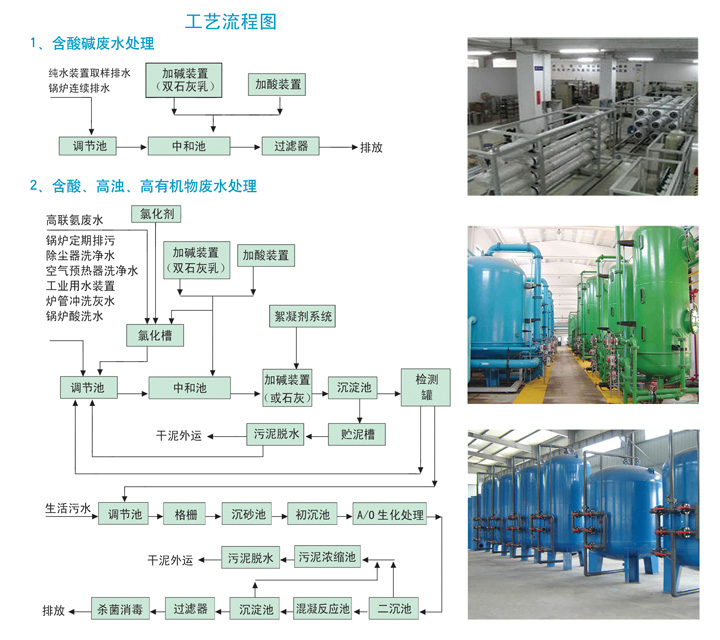 根據(jù)來水水質(zhì)和處理后的水質(zhì)標準,對純水裝置、取樣排水、鍋爐連續(xù)排水采用中和和過濾處理;對鍋爐酸洗水、鍋爐定期排污、除塵器洗凈水、空氣預(yù)熱器洗凈水、工業(yè)用水裝置、爐管沖洗灰水、爐筒洗凈水采用我們開發(fā)的物理化學(xué)法+生物法,即中和、絮凝、沉淀、生化處理、混凝、再過濾和殺菌工藝。